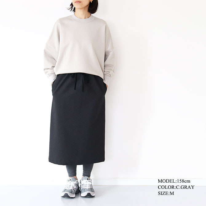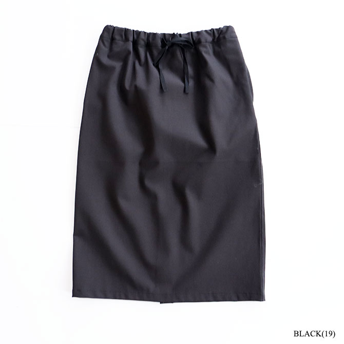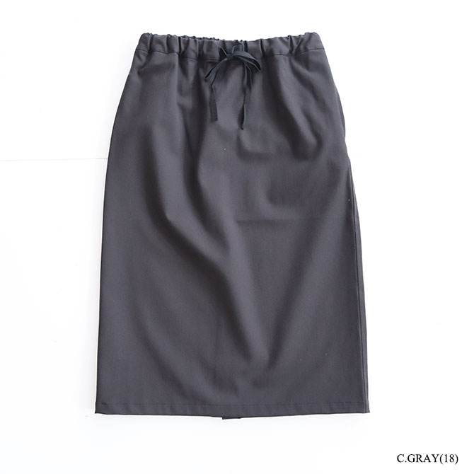 T/C混紡糸を使用したミモレ丈のセミタイトスカート。