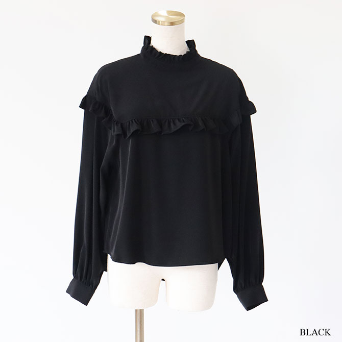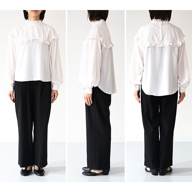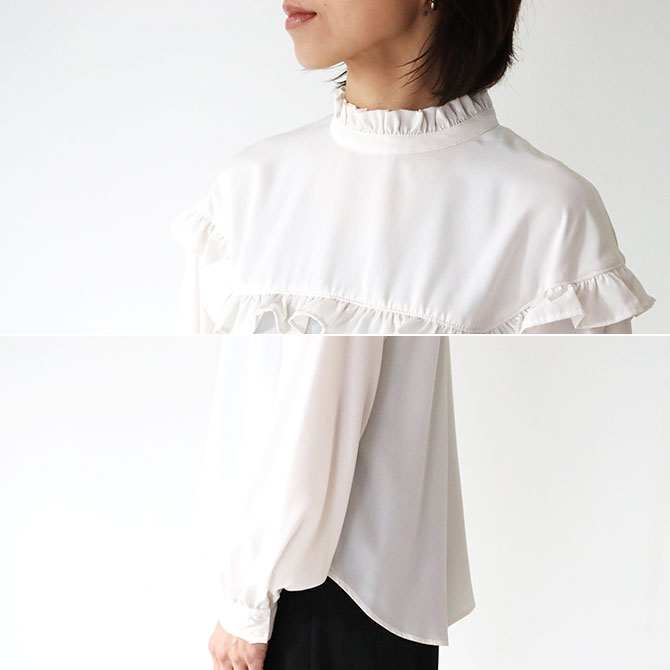 肩から丸くドロップさせて、スクエアラインにカッティングを入れ、フリルをあしらったブラウス。